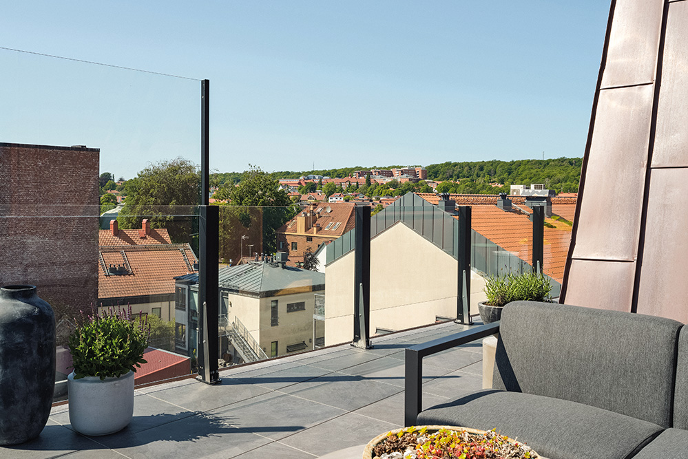 ClickitUpBalcony est adapté aux installations exposées aux intempéries sur balcons et terrasses sur toit. La section droite est disponible en dimensions standard et sur mesure, et en deux hauteurs.